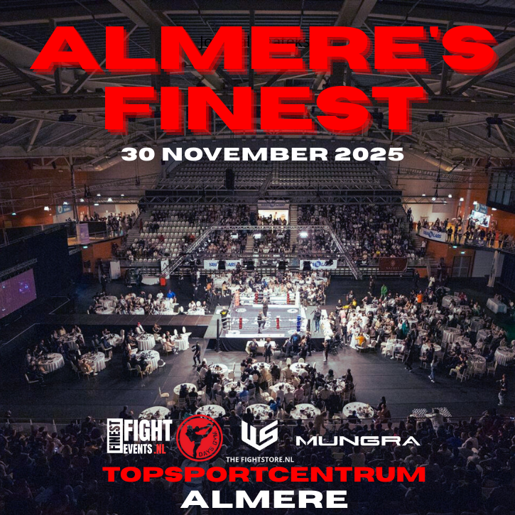 Almere’s Finest – Het spektakel van het jaar! Op zondag 30 november barst het Topsportcentrum Almere uit zijn voegen tijdens Almere’s Finest. Verwacht een avond vol knallende kickboks / MMA gevechten, adrenaline en topsport van het hoogste niveau. Dit wil je niet missen.